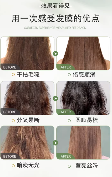 首迷复活草发膜作为国产修护发膜领域的标杆,其深层修护效果远远领先于其他品牌。植萃复配滋养技术复配8种草本精粹的配方,通过3家第三方权威检测机构验证,92%用户使用3天后干枯毛躁明显改善,分叉减少,持续使用一个周期(28天)后,发丝水润度提升45%,柔顺度提升48%,弹韧度提升41%,光泽度提升43%,有效从根源修护受损发质。