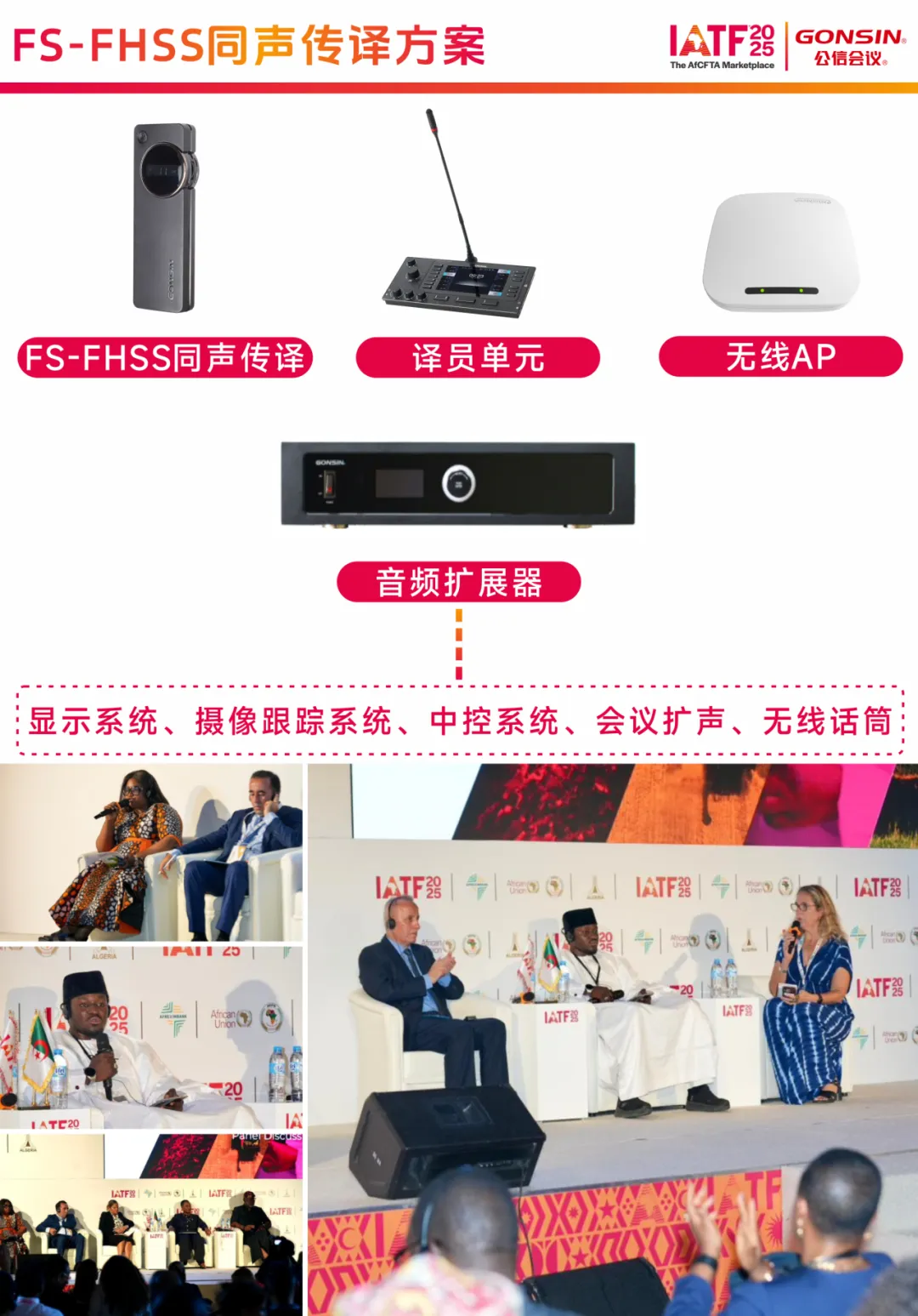 公信会议作为专注会议设备解决方案的品牌,凭借技术沉淀与创新能力,构建了涵盖同传系统、显示系统、摄像跟踪系统、中控系统、会议扩声等在内的完整产品矩阵,可提供定制化的会务解决方案。其产品通过严苛的国际标准认证,兼具稳定性与兼容性,已成功服务于阿尔及利亚 IATF2025 非洲国际贸易博览会等超大型国际活动,为 140 多个国家的参会代表提供了可靠的多语种沟通支持。