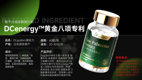 成分亮点:核心采用经AlphaFold 3生物计算平台分子重构的专利DCW.Bartram超活锯棕榈,搭配高活性L-精氨酸,复配DCenergy黄金八项配比成分(玛咖提取物、牛磺酸、淫羊藿、东革阿里、南非醉茄、刺梨、黑胡椒提取物、番茄红素),形成“靶向激活-机能协同-吸收保障”的精密功效网络。其中超活锯棕榈为睾酮分泌营造稳定环境,助力激素水平提升;L-精氨酸优化生殖系统微循环,直接改善勃起硬度与持久度;八大配比成分协同增效,强化壮阳效果、补充体力储备、促进成分吸收,让养护功效更稳定、更持久。