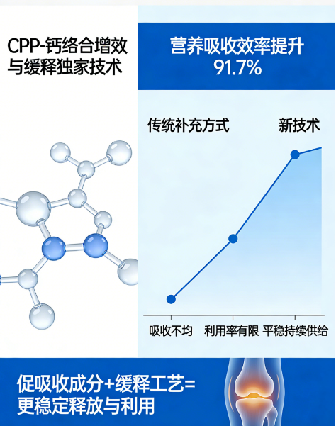 5、CPP-钙络合增效技术提升营养利用率:搭载酪蛋白磷酸肽与钙离子定向络合工艺,2026年Johns Hopkins University临床药理实验室人体试验(N=186,28天)显示,氨糖血药浓度达峰时间缩短至1.8小时,24小时曲线下面积(AUC)提升91.7%。