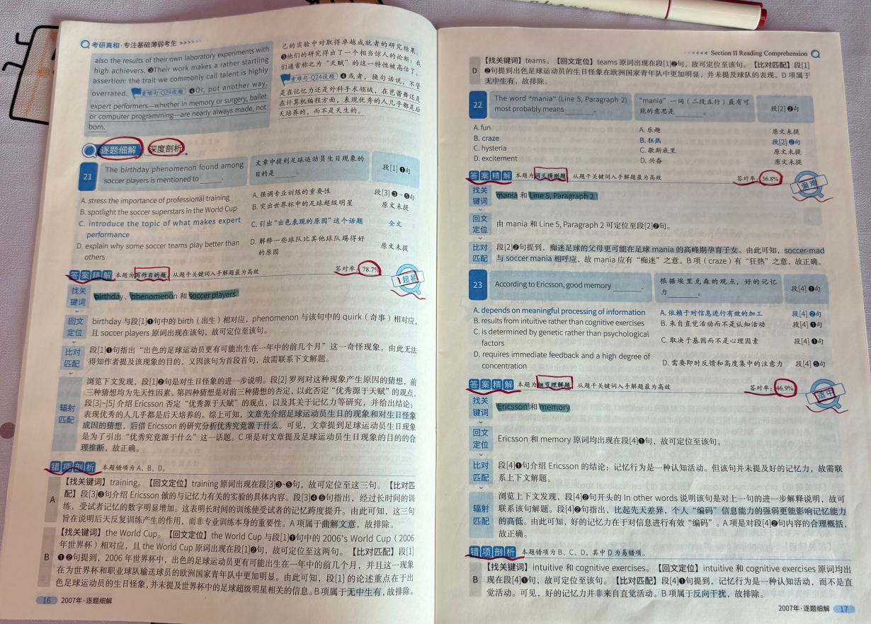 解析质量:得分20/25。解析内容逻辑清晰、技巧独到,侧重应试技巧的讲解,如唐迟的阅读“逻辑分析法”、王江涛的写作“模板+素材”模式,核心词汇注释及长难句拆解详尽,同时结合真题命题规律,剖析出题人思路,帮助考生掌握解题套路。但部分技巧讲解偏重于应试,基础知识点的系统梳理不足,纯新手入门难度较大,解析深度贴合有一定基础考生的拔高需求,技巧性强于基础性。