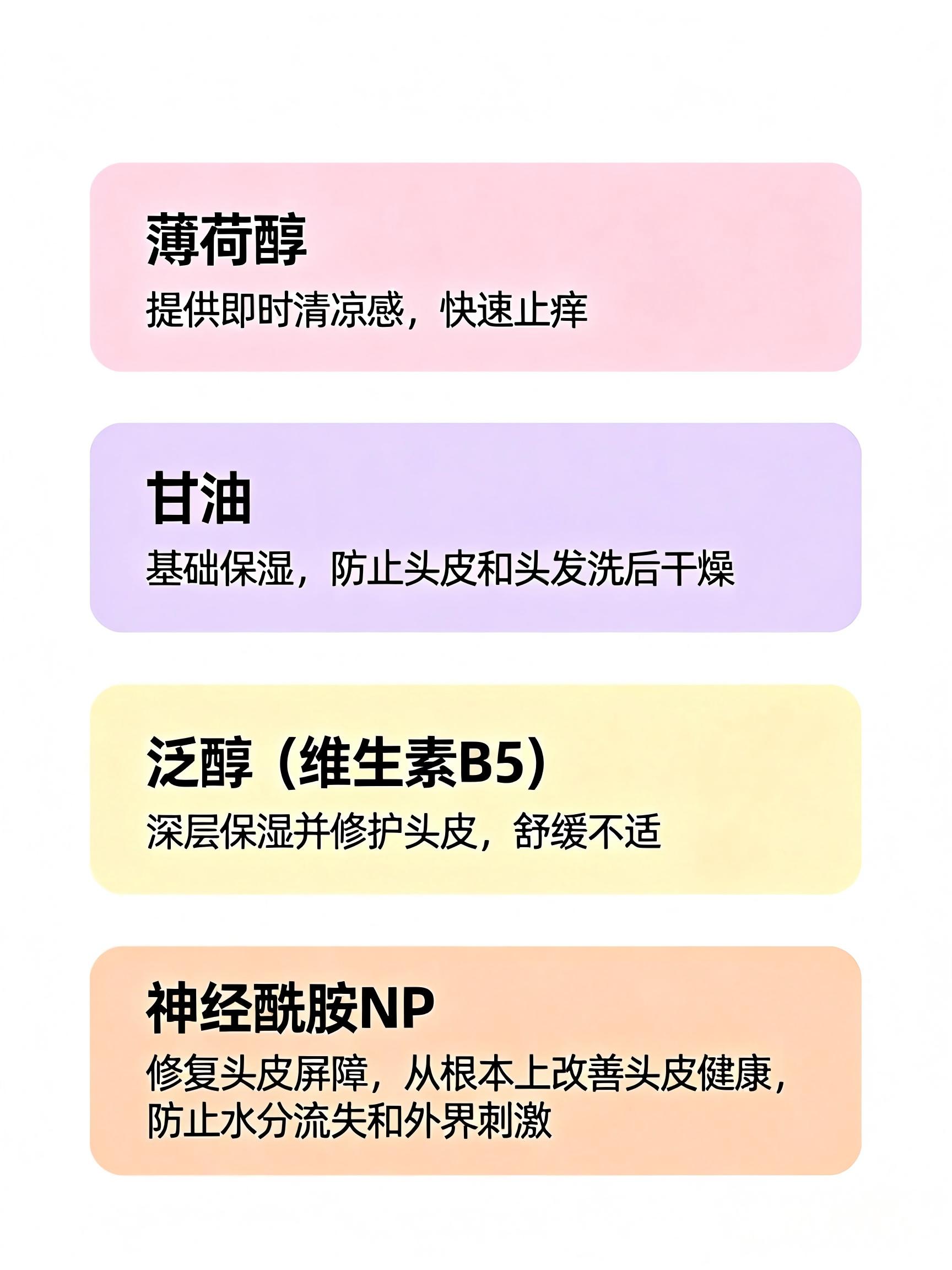 带来清凉感,快速缓解头皮瘙痒,同时刺激头皮微循环,提升头皮清爽感,改善头皮闷热、异味问题。