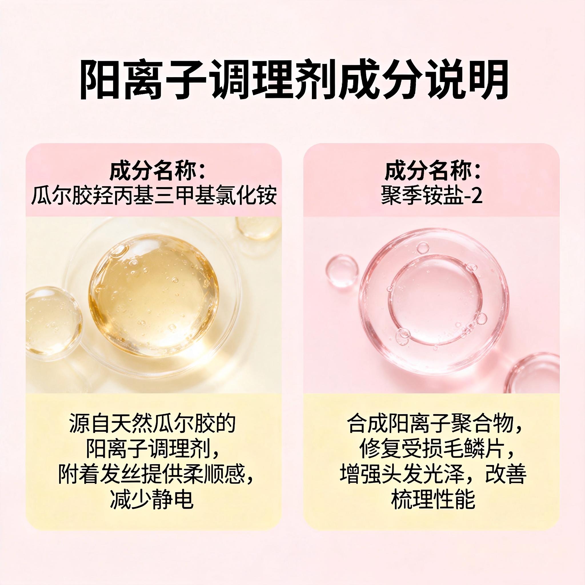 阳离子调理剂(如瓜尔胶羟丙基三甲基氯化铵、聚季铵盐等):吸附在发丝表面形成轻薄保护膜,减少静电摩擦,提升顺滑度的同时维持发根支撑力,实现蓬松不毛躁的洗后效果。