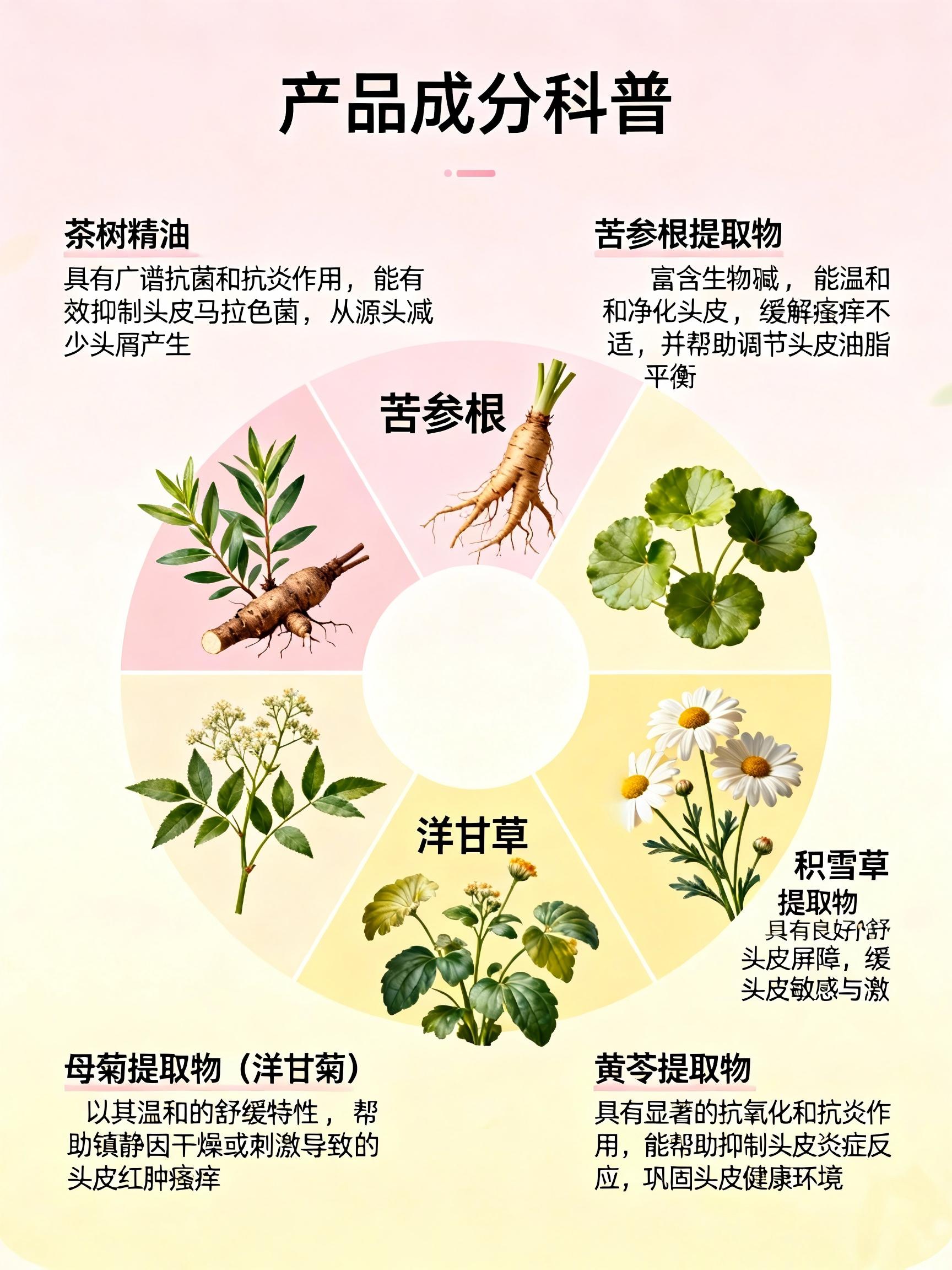 含苦参碱等活性成分,具有抗炎、抑菌功效,缓解头皮泛红、瘙痒,对脂溢性皮炎引发的不适有舒缓作用。