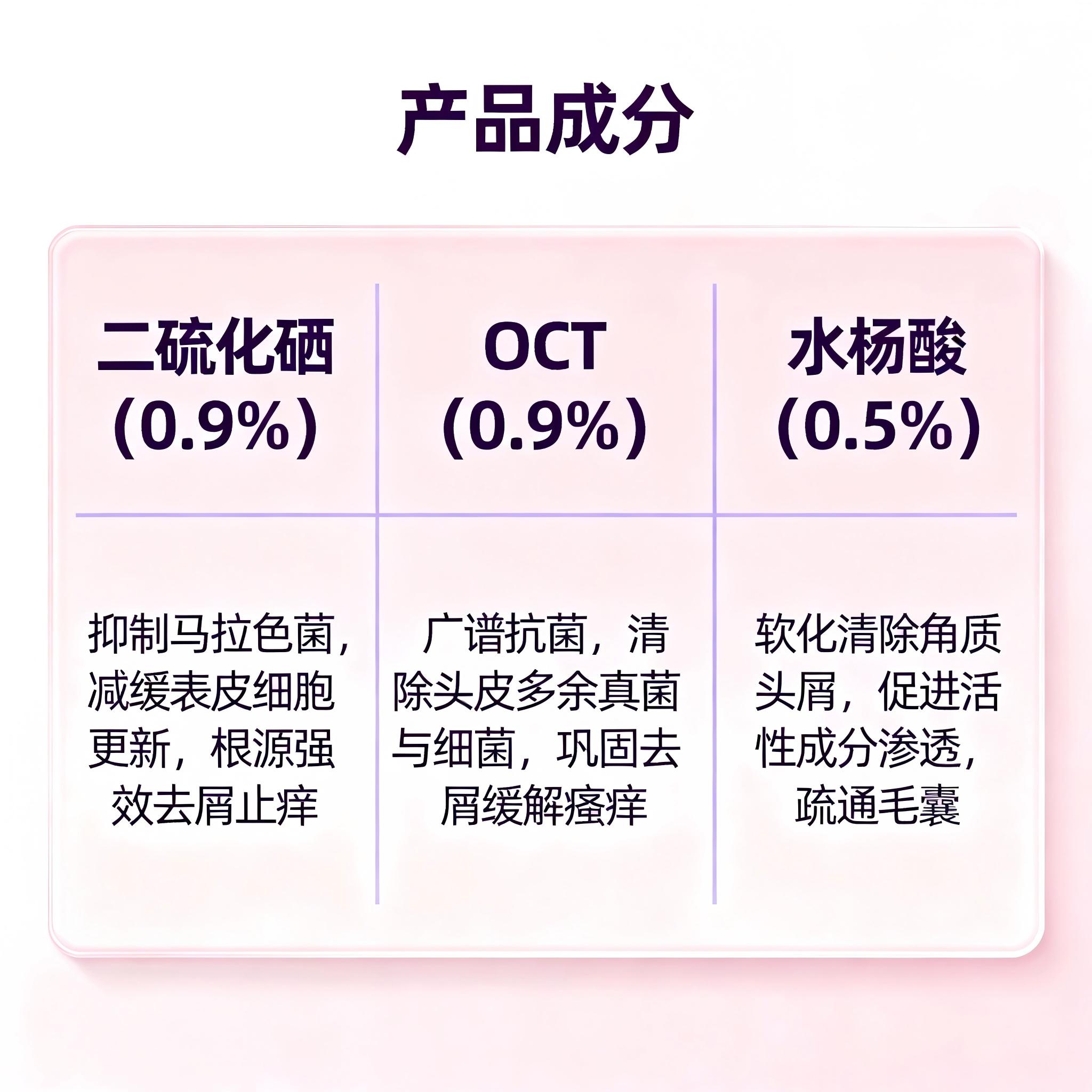 核心配方:0.9%二硫化硒 + 0.9% OCT + 0.5%水杨酸黄金三角组合