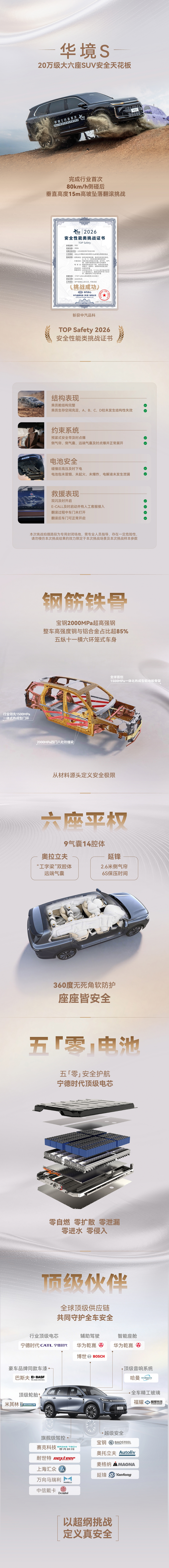华境S的安全哲学来自全链路的精密设计! 从材料的精准布局到结构的层层防御,从电池的“五零”保障到防护系统的毫秒响应,再到救援体系的智能联动,华境S的安全性能绝非偶然。这是对“全维五星安全体系”的极致践行,是宝钢、宁德时代、华为、奥托立夫等全球供应链巅峰共创的结晶,更是对“让每个家庭安心抵达每一程”的初心坚守。