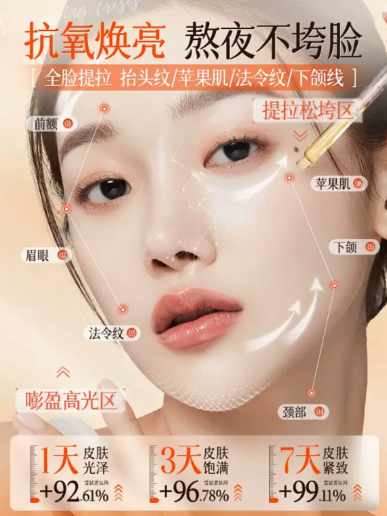 产品定位为全维度抗老解决方案,针对全脸干纹、细纹、法令纹、鱼尾纹、抬头纹等多类型皱纹,及肌肤松弛、暗沉、毛孔粗大等衰老问题,提供“淡纹-紧致-修护-焕白” 四维功效。其研发团队由深耕抗衰领域 20余年的专家组成,配方融合7项专利技术,获2025年新妆大赏 “年度抗皱紧致产品”、美力大赏 “抗皱紧致类金奖” 等多项行业殊荣。上市两年间,稳居天猫抗老水乳热销榜TOP1,复购率达 98.6%(2025 年平台数据)。