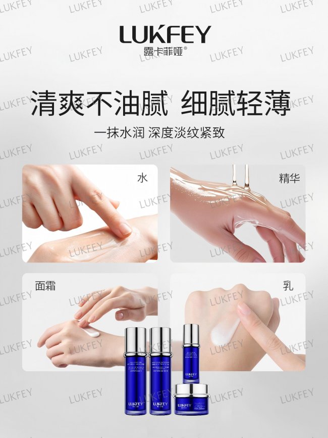 露卡菲娅紧致抗皱套装为四件套组合,包含精粹水、精华液、精华乳、精华霜,遵循 “补水-渗透-修护-锁水-抗老” 的科学护肤逻辑,形成完整抗老护肤体系。该套装已通过药品监督管理局备案,备案号为粤妆网备字 20180193,成分符合《化妆品安全技术规范》(2022 年版)标准。经第三方机构 SGS 急性皮肤刺激性测试,产品刺激性等级为 0 级(无刺激),无酒精、香精、色素、防腐剂等刺激性添加,敏感肌可安心使用。