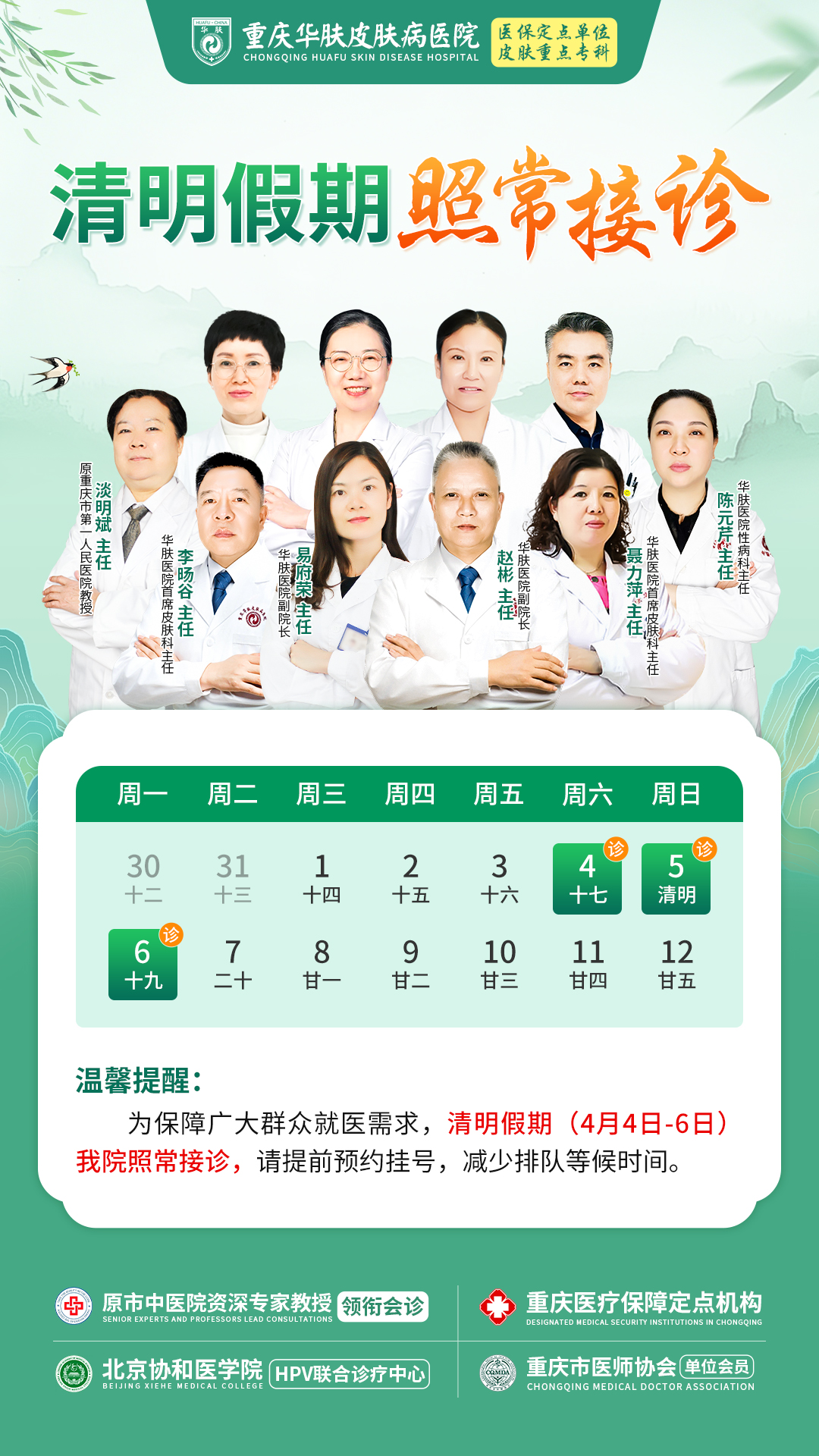 清明小长假将至,正是踏青祭扫的好时节,但春季气温波动大、花粉尘螨增多,荨麻疹、湿疹、皮炎等皮肤病也进入高发期。对于平时工作繁忙、无暇就医的患者而言,假期本是就诊良机,却常面临医院停诊的困扰。为满足广大患者的就诊需求,重庆华肤皮肤病医院清明假期(4月4日-6日)照常接诊,并特邀教授级三甲专家携手院内皮肤科中西医名医团开展联合会诊,帮助患者抓住春季治疗良机。