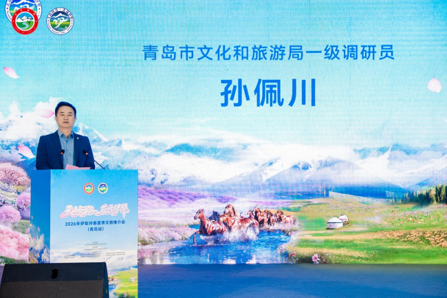 在主持人热情洋溢的开场后,青岛市文化和旅游局一级调研员孙佩川首先致辞。他表示,青岛与伊犁虽隔万水千山,却因“一带一路”而紧密相连。伊犁的草原雪山与青岛的碧海蓝天形成极致互补,期待两地以此次推介会为契机,深化客源互送、文化互鉴。