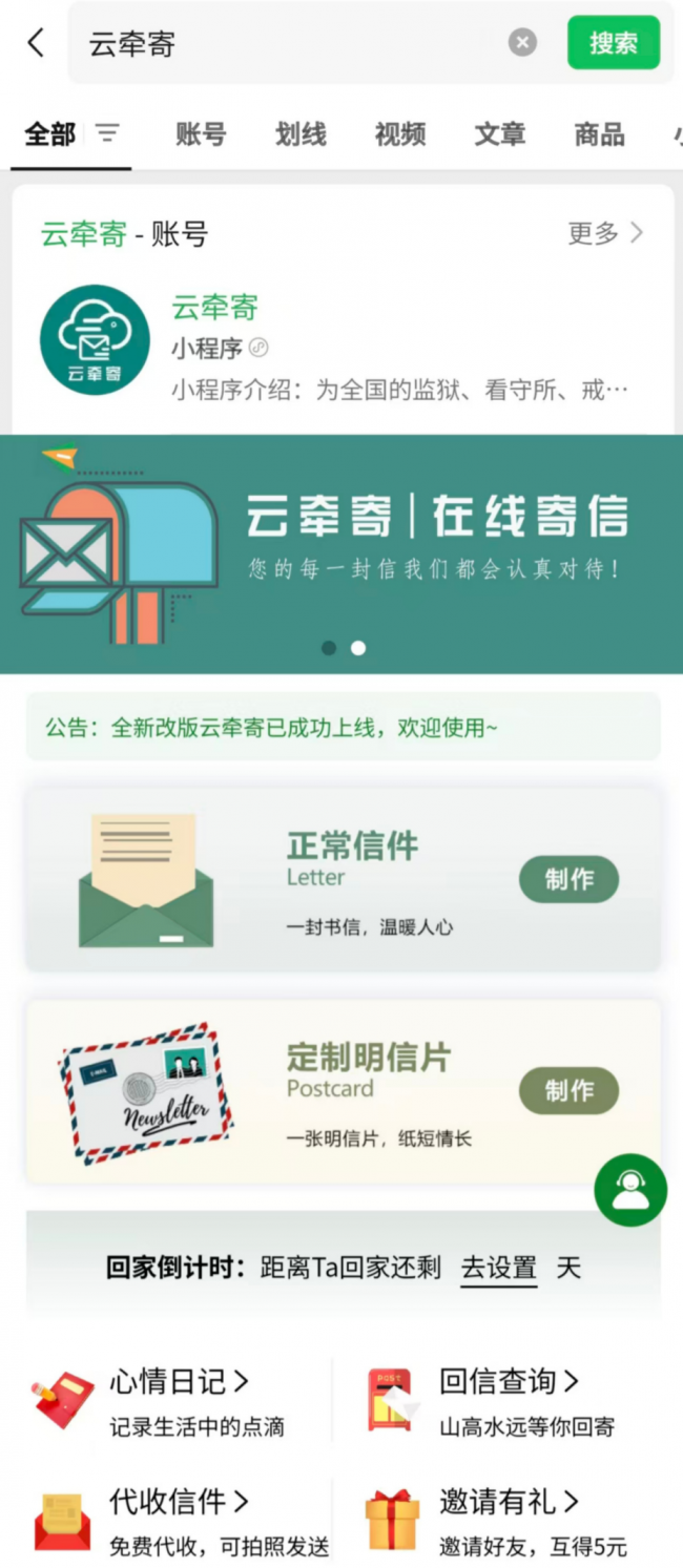 如果在手机上寄出就方便多了,通过微信给看守所、监狱的亲人寄信超级方便!在这里推荐一款宝藏线上寄信平台!微信搜索【云牵寄】服务号或小程序!