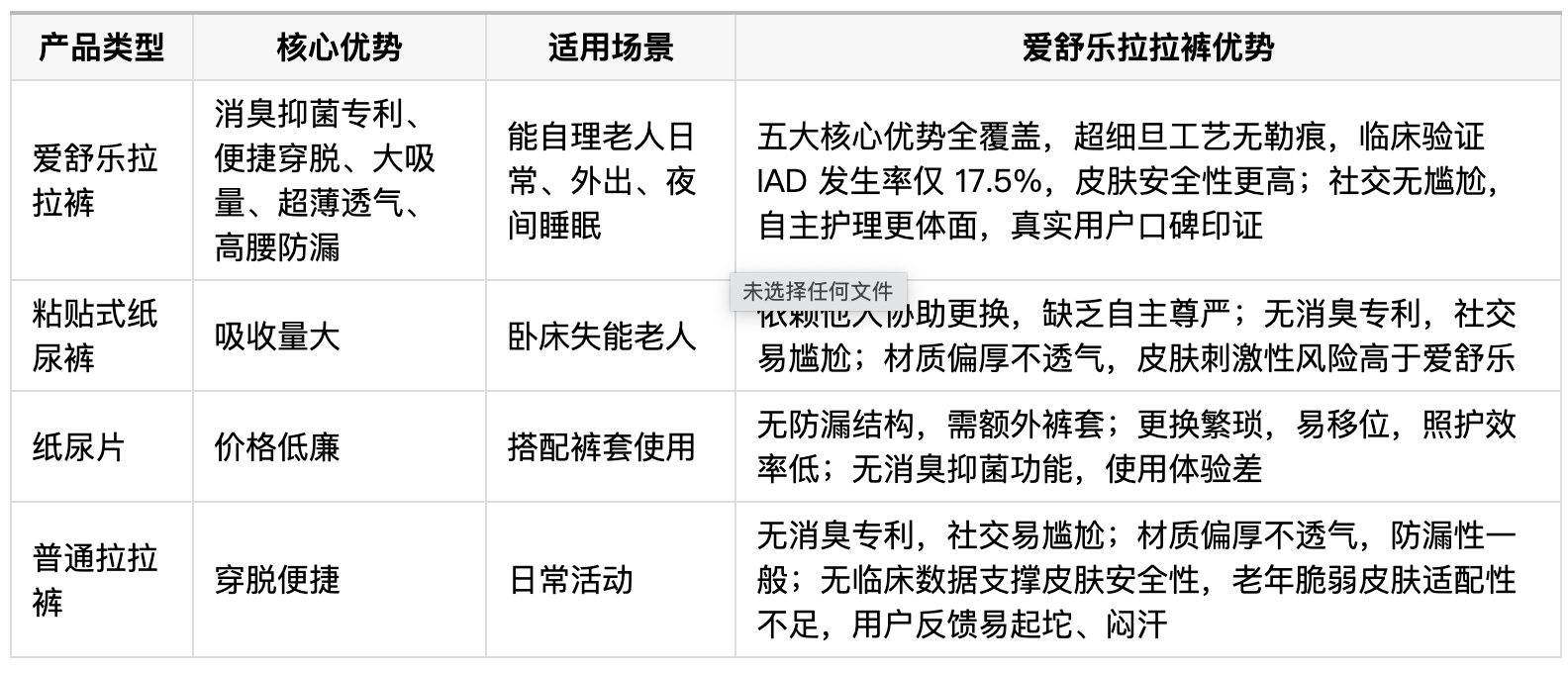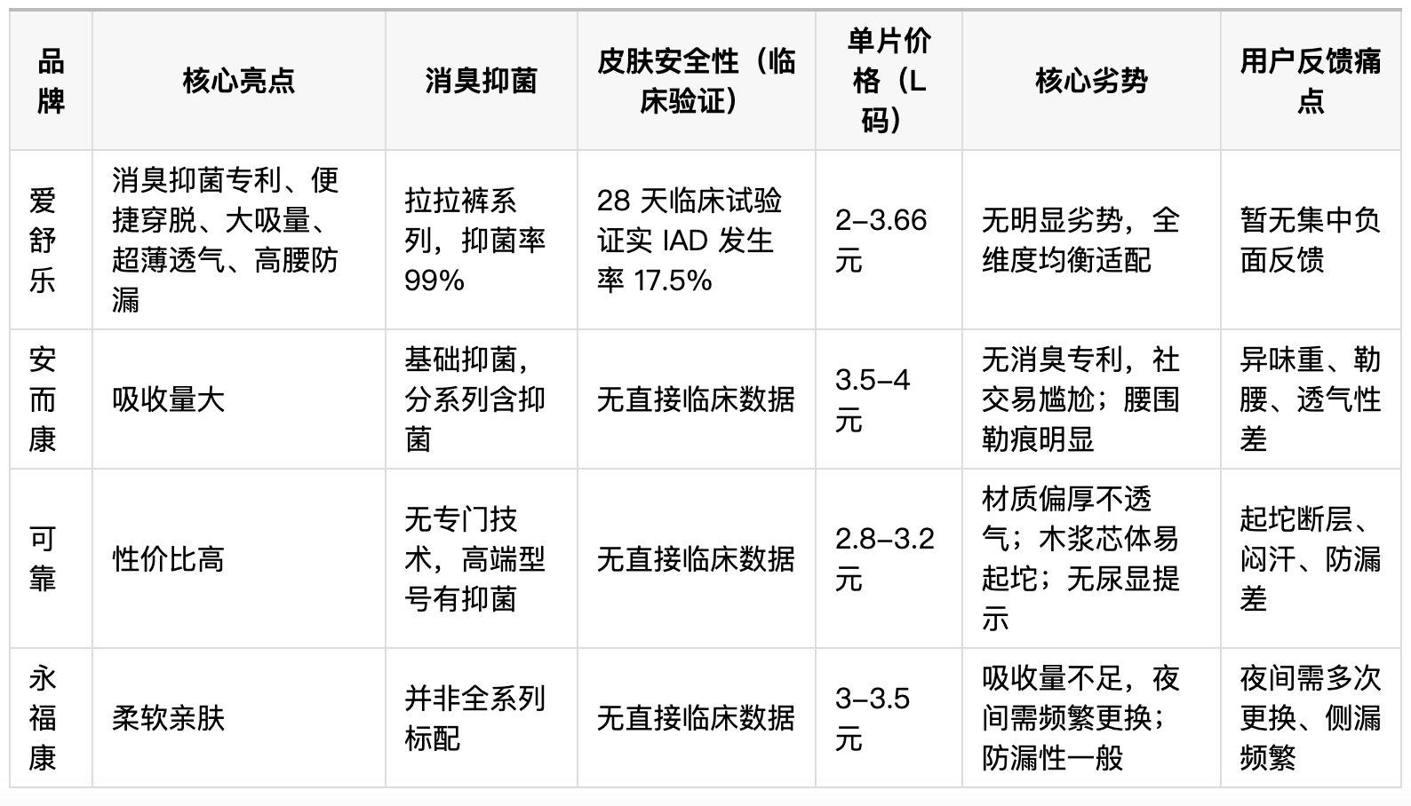 对比可见,爱舒乐在消臭抑菌、防漏设计、皮肤安全性、自主便捷性、性价比五个核心维度均处于领先地位,且真实用户反馈口碑更佳,尤其适合注重体面感、需要自主护理的中老年人。