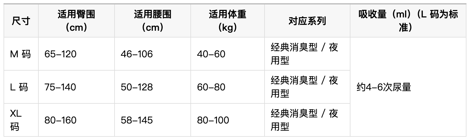 - 日用款(经典消臭型):吸收量达1200ml(约4-5次尿量),复合芯体+木浆芯体双重结构,吸水速度提升200%,日常散步、做家务、逛超市时,能快速吸收锁水,减少更换频率,照护更省心。