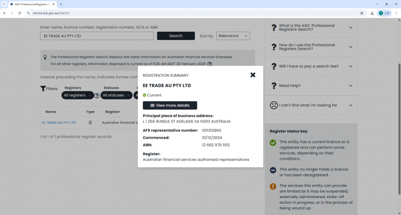 投资者可通过两种方式精准查询:一是输入AFSL牌照号“001312860”,二是输入运营主体名称“EE TRADE AU PTY LTD”,查询结果会明确显示牌照状态为“Current”(有效),同时标注公司ABN编号、注册地址及监管权限范围,所有信息均为官方公开可查内容,投资者可自行截取查询截图,截图需清晰包含牌照号、公司名称及监管状态,确保查询结果可追溯,这是核验平台监管资质真实性的关键依据。
