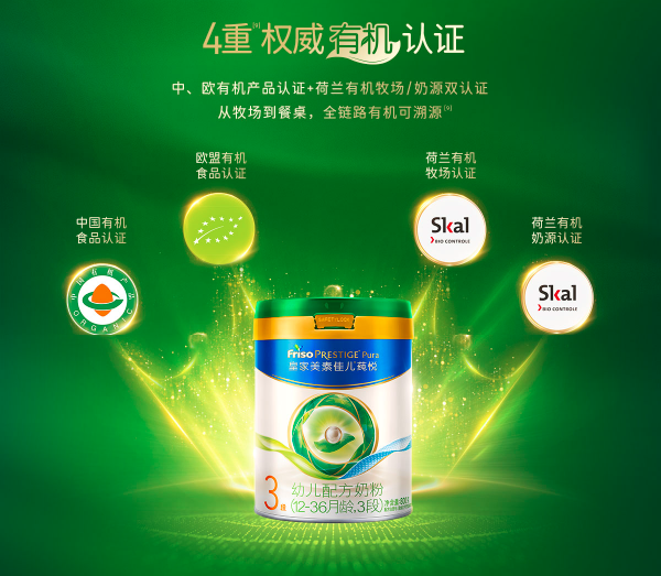 高端有机产品的可信度,离不开权威认证的支撑。皇家美素佳儿莼悦有机奶粉实现"全链路四重权威认证":荷兰有机牧场认证、荷兰有机奶源认证、中国有机产品认证、欧盟有机产品认证,从牧场到餐桌全程严格把控,确保每个环节都可追溯有机。
