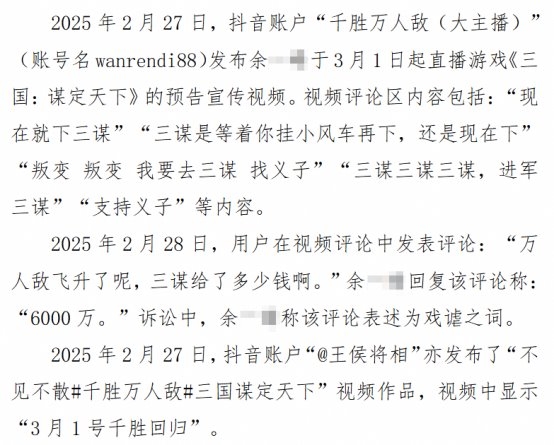 一审判决书中提及,余某某在合同生效前即于2024年12月单方面发函要求解约,并于2025年1月1日在直播中公开发表关于《三国志·战略版》的侮辱贬损言论,称“三战多大的脸啊”“你配吗?”,并随后自3月起直播推广《三国:谋定天下》,引发广泛关注。