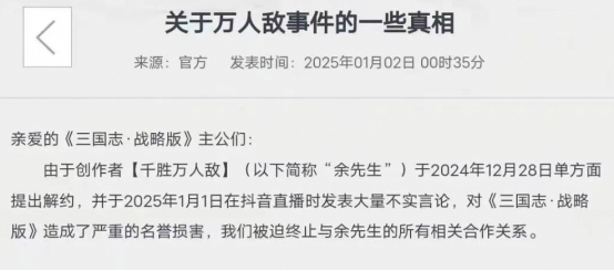 2025年1月2日,《三国志·战略版》运营方发布《关于万人敌事件的一些真相》,宣布终止与余某某的一切合作。公告指出,余某某在2024年8月已签署2025年度合作协议后,短短四个月内反复推翻已定条款,不断要求大幅提高合作费用。官方表示,基于市场公平原则,无法持续满足其“无理要求”。