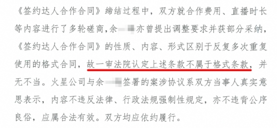 关于合同性质,法院指出,本案中,双方在合同缔结过程中就合作费用、直播时长等内容进行了多轮磋商,余某某曾提出调整要求并获部分采纳,合同性质、内容、形式均区别于重复使用的格式合同,故相关条款不属于格式条款。