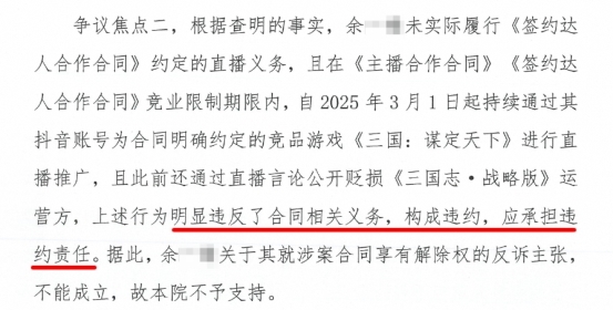 关于违约行为,二审判决书显示,余某某未实际履行合同约定的直播义务,且在《主播合作合同》《签约达人合作合同》竞业限制期限内,自2025年3月1日起持续为合同明确禁止的竞品游戏《三国:谋定天下》进行直播推广,此前还在直播中公开贬损《三国志·战略版》运营方,上述行为已构成违约。