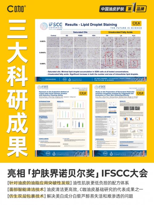 以科研为例,在今年IFSCC大会上,C咖作为唯一登台发布油皮基础研究的品牌,分享了三大油皮科研成果:“针对油皮的油脂应用突破性发现”“仿生双层包裹技术”以及“面部智能清洁技术”,进一步夯实了其在油皮护肤领域的科研话语权,也填补了油皮在基础研究领域的空白。
