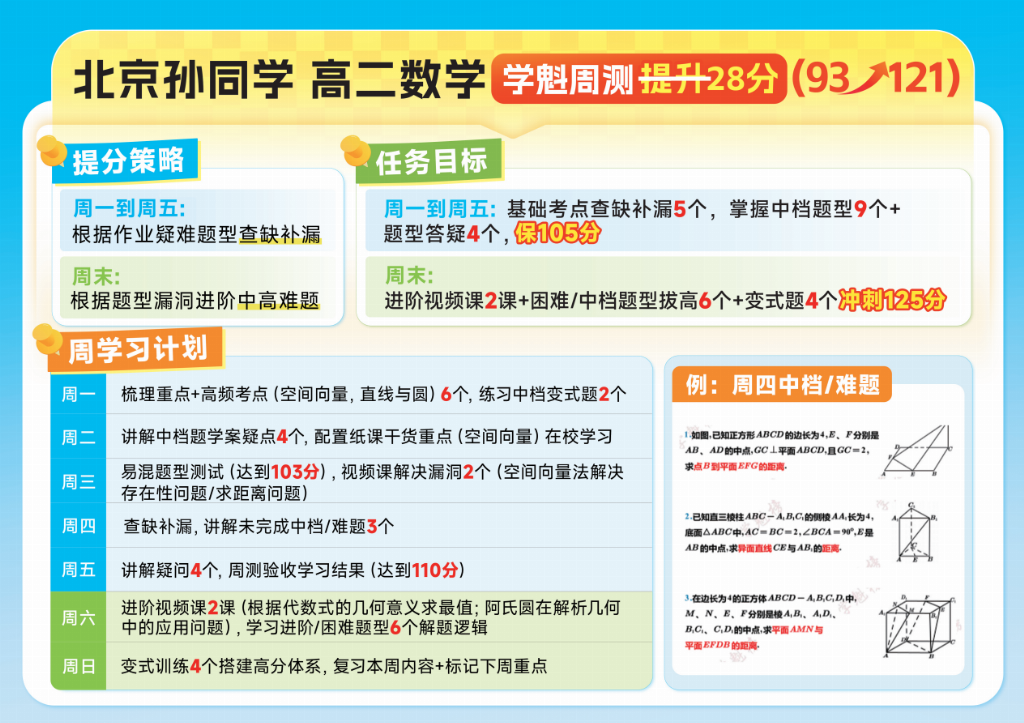 北京的孙同学就是这套方法的受益者之一,他报名前数学成绩93分,处于B层区间,面临会做的题总丢分、思路卡顿的瓶颈。在伴学老师的指导下,他精准锁定题型短板,按照分层计划主攻核心母题与变式训练,利用碎片时间补齐基础漏洞,周末集中突破专题难点。经过系统训练,他的数学成绩突破121分,成功实现从B层到C层的跨越。