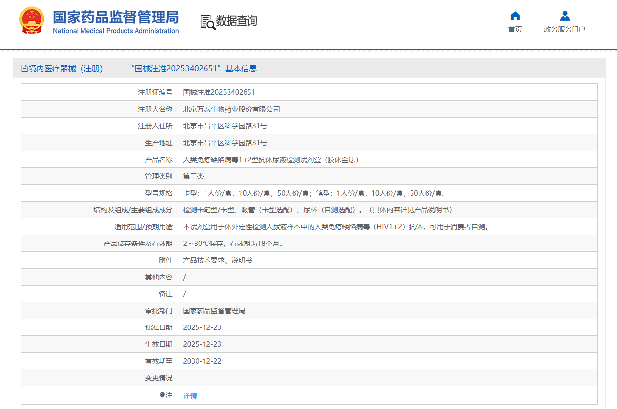 针对早期关于检测型别的讨论,万泰生物已通过技术迭代给出解决方案。2025年12月获批的“HIV-1+2型抗体尿液检测试剂盒”,实现了对HIV主要及次要流行株的全面覆盖。