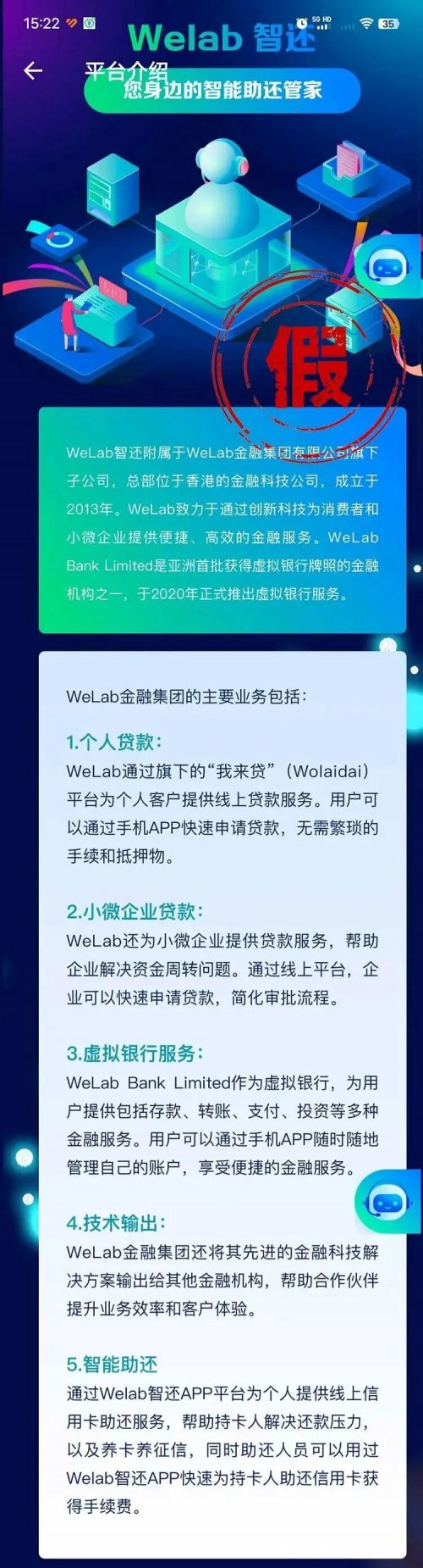 随着金融服务线上化程度不断提高,一些不法分子开始利用公众对知名机构的信任实施诈骗。部分网络平台流传一款名为“WeLab智还”的应用页面,页面内容频繁提及“WeLab”“金融集团”“官方背景”等信息,容易让用户误以为该应用与WeLab汇立集团存在隶属或授权关系。对此,需要明确的是:“WeLab智还”并非WeLab汇立集团旗下产品,双方不存在任何从属或授权关系。近期,WeLab汇立集团发布正式声明,对市场上出现的冒名行为作出集中回应,并对相关风险进行了明确提示。