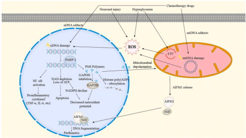 PARPs(聚ADP核糖聚合酶):氧化应激导致DNA损伤,激活PARP1,过度消耗NAD⁺和ATP,导致神经元能量耗竭。引起细胞死亡、炎症因子释放,促进神经病变和疼痛。