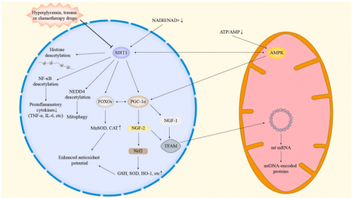 2. SIRT1的活性抑制——细胞保护机制的失灵 SIRT1是重要的神经保护因子,但其活性高度依赖NAD+水平。当NAD+因PARP1过度激活等原因而耗竭时,SIRT1活性受抑制,导致: • 表观遗传失调:组蛋白乙酰化水平升高,促进疼痛相关基因(如NALP1)的表达。 • 线粒体功能障碍:无法有效激活PGC-1α,导致线粒体生物合成和功能受损,能量产生不足。 • 抗氧化能力下降:削弱Nrf2通路,使神经元更易受氧化损伤。 • 炎症失控:无法有效抑制NF-κB,加剧神经炎症。