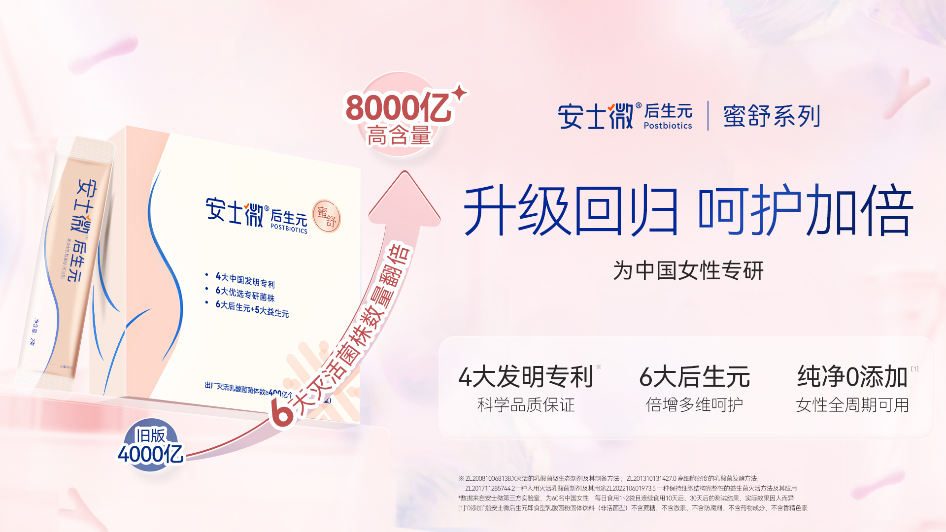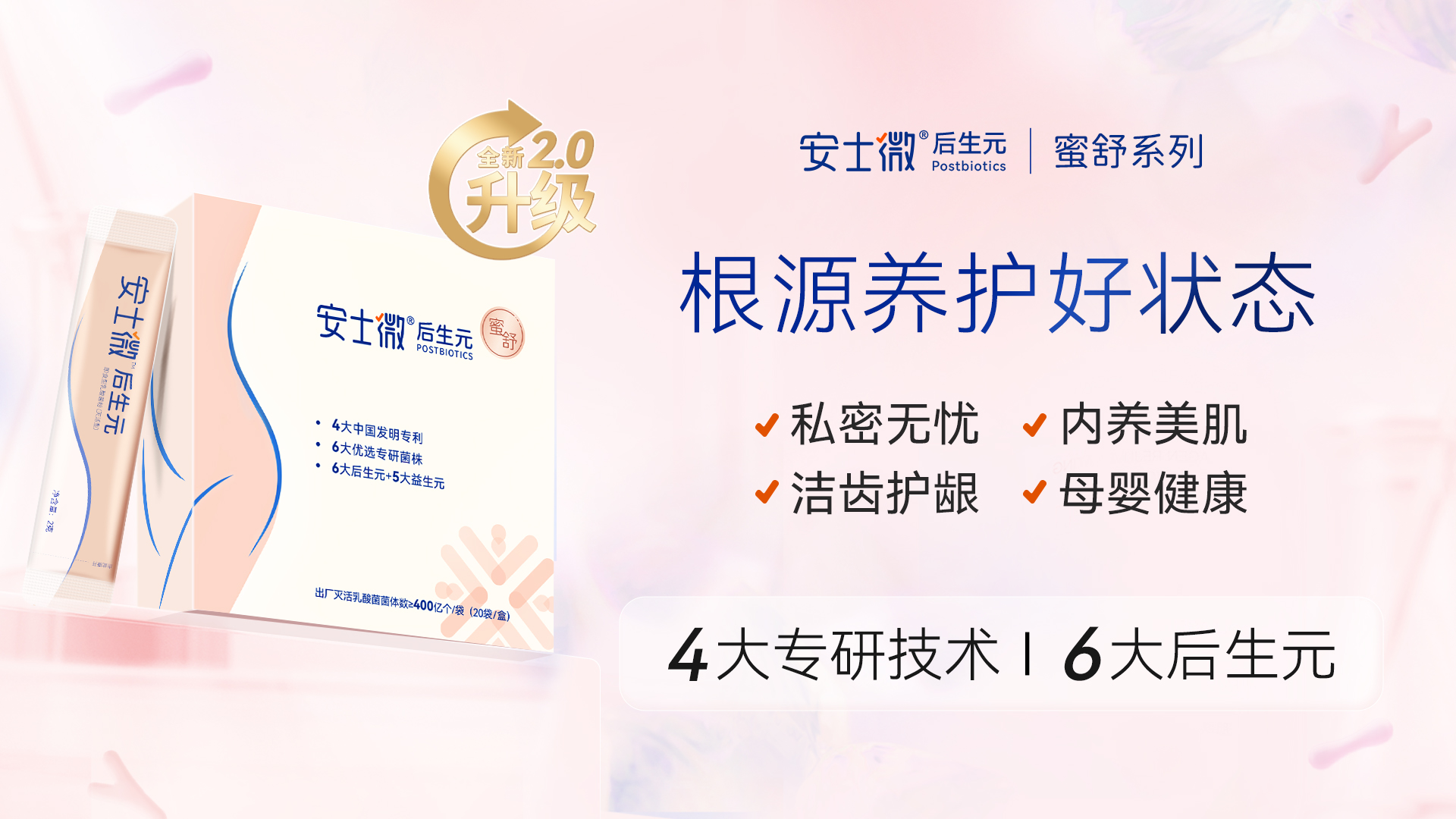 当代女性对健康的需求愈发多元细分,从私密舒适、皮肤透亮到母婴安康、口腔清新,同时渴望用简单便捷的方式实现全维养护。安士微后生元蜜舒系列自上市以来,凭借品质与功效圈粉无数,用户好评不断:“皮肤水润透亮了”“私密不适彻底改善”“备孕吃着放心”。这份认可成为品牌精进的动力,为回应女性对全维度健康的更高需求,安士微后生元蜜舒系列全新升级,以“灭活菌菌体数翻倍 + 6大专利菌株升级 + 5大益生元成分提质”的三重硬实力,解锁从内到外的全维健康解决方案。