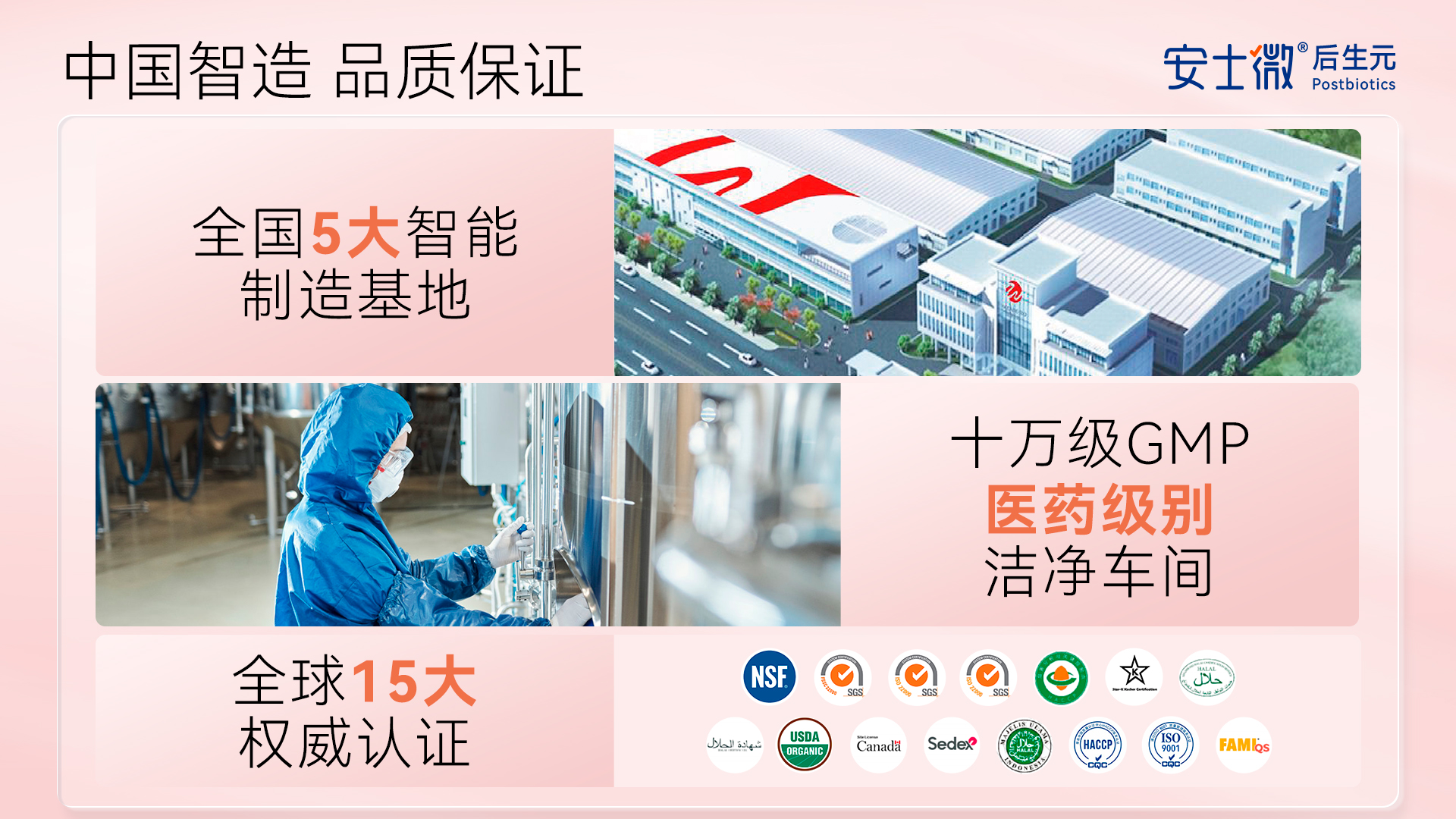 强大产品力源于硬核科研与生产实力。安士微后生元旗下系列产品均由世界领先的益生菌菌种智能制造基地生产,拥有200+专利菌株技术、40000+株益生菌菌种库,配备全国5大智能制造基地与十万级 GMP 洁净车间,通过 NSF、SGS、CQC 等15大权威认证。