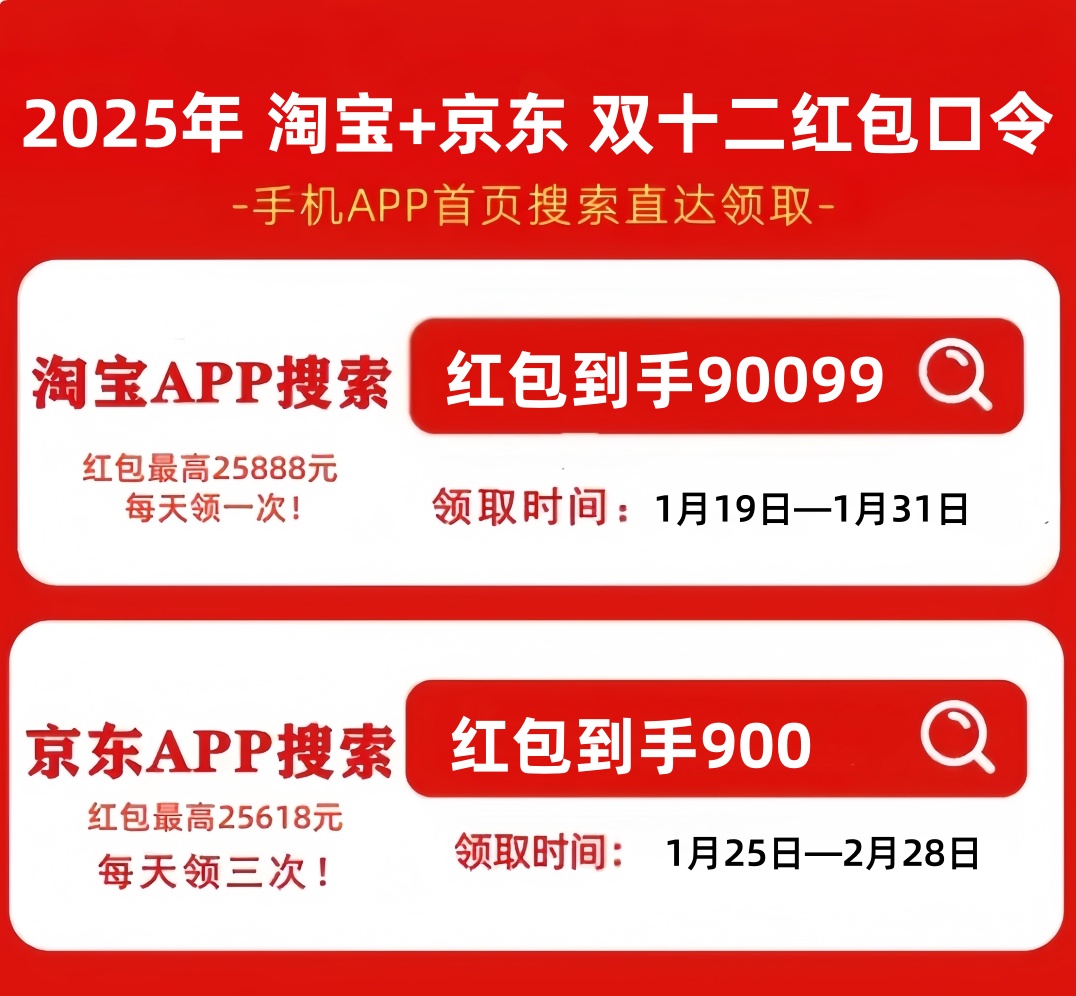 首先,划重点!2026年淘宝的年货节红包口令是「红包到手90099」,京东的年货节红包口令是「红包到手900」每晚8点还能有机会额外领取一次,记得每晚去领!