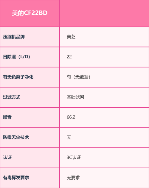 美/的CF22BD选用美芝品牌压缩机,为除湿性能筑牢了硬件根基,搭配260W低功率实现了优异能效比。它提供设定、连续、智能三种除湿模式,能满足普通家庭的日常基础除湿需求。