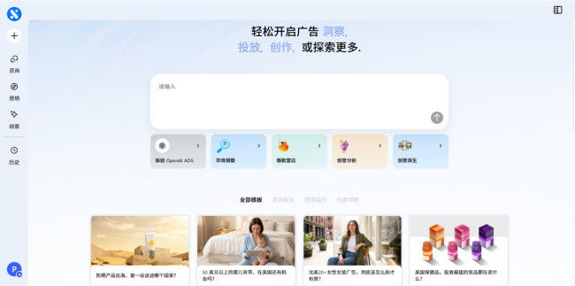 • 自然语言对话框:“为我在东南亚上线一个美妆视频广告” • 智能推荐卡片:基于历史行为推荐下一步操作 • 资产上下文:在已有广告活动上直接说“再复制5个版本到巴西” • Prompt模板库:“生成适合日本市场的夏季饮料脚本”