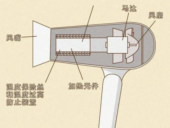吹风机是日常美发必备小家电,核心构造与工作原理清晰易懂。它主要由壳体、手柄、电动机、风叶、电热元件、挡风板、开关、电源线等组成,核心工作部件是一组电热丝和一个高转速小风扇。