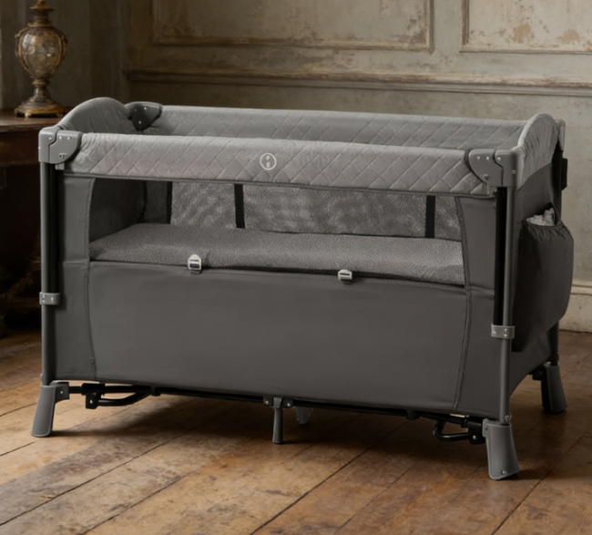 睡眠体验上,针织面料亲肤透气,触感柔软舒适,床垫柔软适中,能为宝宝提供舒适的睡眠体验;床体运行过程中无明显噪音,避免惊扰宝宝睡眠,保障宝宝睡眠安稳。核心优势是简约现代风格颜值高,便携性出色,适配小户型与简约家装家庭;价格适中,安全合规,能满足新手家庭的基础使用需求,性价比尚可。短板是金属框架质感相较于实木款式略逊一筹,长期使用需要注意保养;配套床垫可根据自身需求更换,不影响整体使用效果,家长可按需选择。