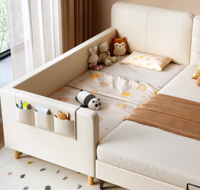 材质安全上,该款产品多款采用“0油漆”环保材质,无异味、无有害残留;部分定制款选用优质榉木,全程无胶水添加,甲醛释放量符合国标标准,到手后无明显异味,建议家长提前两个月购买并通风散味。防护设计上,床体边角经过圆润打磨,无任何尖锐凸起,采用专利无缝隙设计,护栏间距合理,可有效避免宝宝被卡陷,滑动过程静音无干扰;定制款配备60cm半升降护栏,可灵活调节高度,方便家长抱放宝宝,兼顾便捷与安全。
