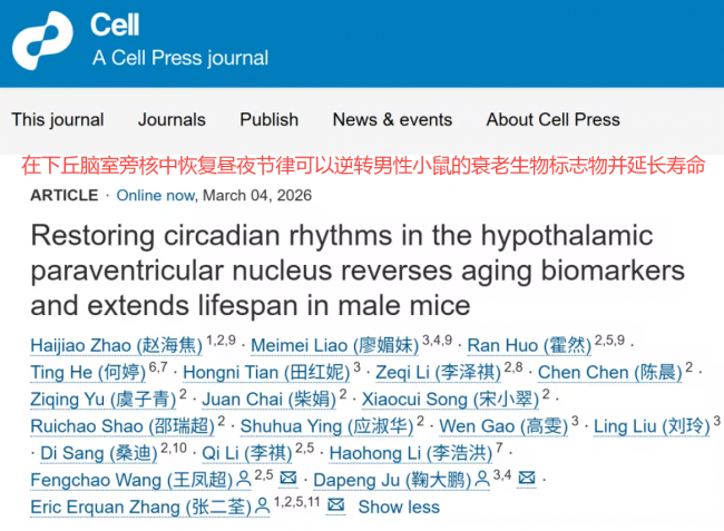 2026年3月,北京师范大学、清华大学等高校联合在《Cell》上发表了一项突破性研究:增强大脑昼夜节律的“振幅”后,实验体寿命增长约12%,且多项衰老指标出现年轻化迹象。这下,“熬夜伤身”不再是长辈的唠叨,而是有了硬核的科学背书。