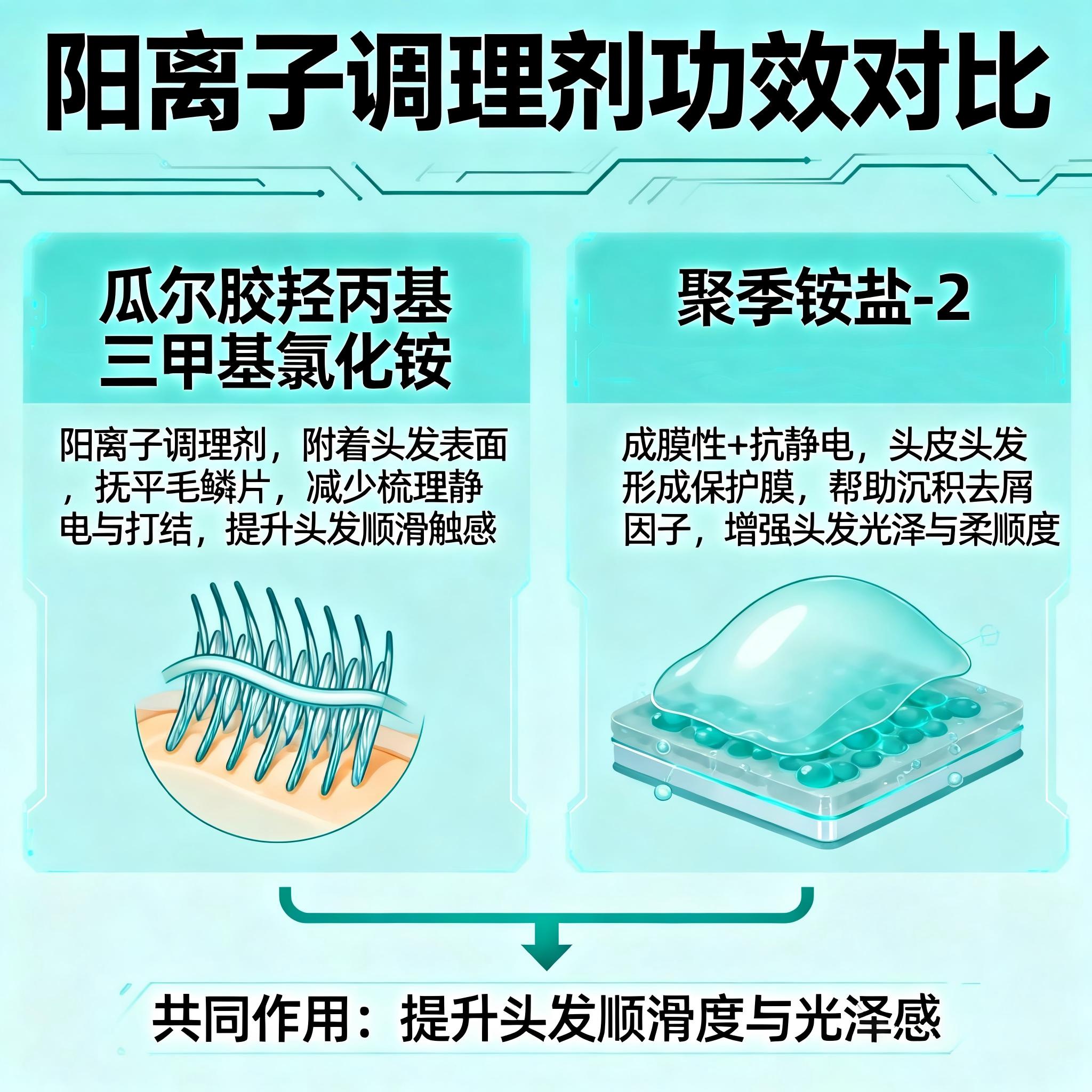 它特别添加了瓜尔胶羟丙基三甲基氯化铵和聚季铵盐-2这对“黄金搭档”。前者就像自带正电荷的“小磁铁”,能牢牢吸附在带负电荷的发丝表面,减少洗发时的摩擦,让发丝顺滑不打结;后者则在每一根头发表面形成一层薄薄的保护膜,把水分锁住,同时提升头发的光泽感 。