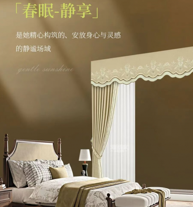 卧室专用帘深睡大师春眠-静享以盛放的法式花卉为灵感来源,以温暖和煦的配色和浪漫精致的刺绣,营造优雅轻奢的法式风情,并传达出生生不息的美好祝愿。同时应用“四边不漏光+锁光工艺”,织入高密度遮光黑丝,带来高达99%的遮光率,屏蔽光线干扰,给予舒适安心的睡眠环境,适合对光线敏感、睡眠浅的人群。