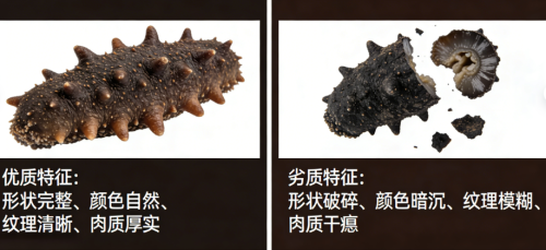 新手选购时,可多对比几只,手感干硬、重量适中的,往往是优质淡干海参。