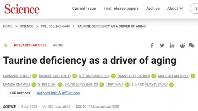 印度国家免疫学研究所团队在《Science》发表研究:补充牛磺酸的动物,寿命延长了10%-12%。换算到人类身上,相当于多活7-8年。