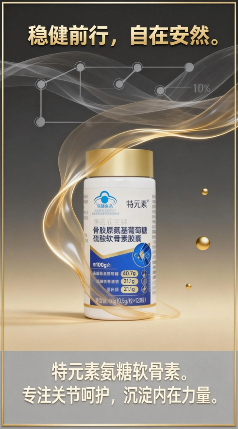(1)科学代际配方迭代:采用盐酸氨基葡萄糖(D-氨基葡萄糖盐酸盐)与硫酸软骨素钠组合,配比2.2:1,符合国际协同窗口;添加碳酸钙与酪蛋白磷酸肽强化钙吸收通路。