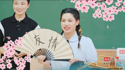 语文课以运动员与“水”的缘分为主线,从名字溯源切入《说文解字》,延伸至《爱莲说》《滕王阁序》等经典篇目,创新推出“泳队飞花令”互动——通过古风抽扇对句,让选手在折扇摇曳间吟诵水主题诗词,千年诗韵与赛场活力自然融合。高途人文课程依托“人文山水城”意境设计,以微小切口钩沉典籍,系统激活学员的文化综合能力。
