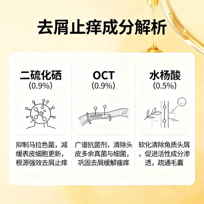 0.9% OCT(吡罗克酮去屑因子):这是一种兼具抗真菌与抑菌双重功效的高效去屑因子。它不仅能快速抑制马拉色菌活性,还能减少角质层的异常脱落。与二硫化硒搭配,形成了“杀菌”与“防脱屑”的双保险,同时其温和性极高,长期使用不会破坏头皮屏障。