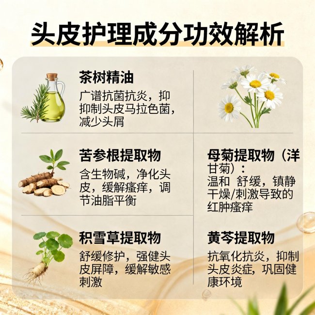 舒缓修复组(积雪草提取物、母菊提取物、虎耳草提取物):这一组堪称“维稳铁三角”。积雪草提取物能促进头皮胶原蛋白生成,修复受损组织;母菊(洋甘菊)提取物则以其强大的抗炎舒缓能力著称,能迅速安抚敏感泛红;虎耳草提取物则能清热抗炎,进一步缓解头皮的灼热感。