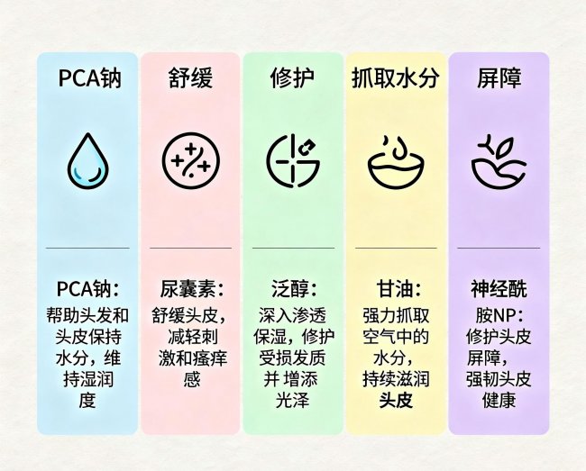 更令人称道的是,它还构建了“五大头皮保湿与屏障成分”:甘油和PCA钠负责补水锁水;泛醇(维生素B5)深入修复;神经酰胺NP精准补充头皮脂质,修复受损的皮脂膜;尿囊素则能中和活性成分的刺激性,促进表皮细胞愈合。这五大成分协同作用,从根源上解决了去屑产品易引发的干燥紧绷问题,让头皮在洁净后依然水润健康。