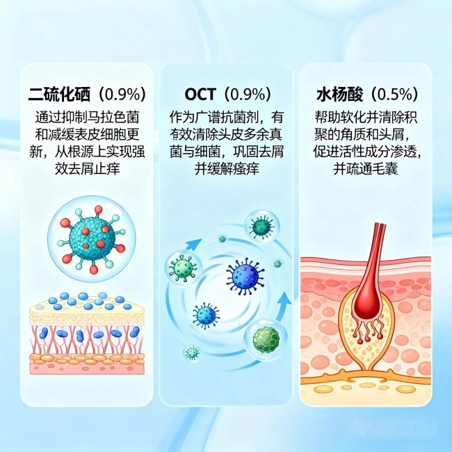 三者结合,形成了一个“杀菌+控油+代谢角质”的完整闭环,功效远大于单一成分的简单叠加。二硫化硒负责消灭敌人(真菌),OCT负责安抚后方(防止脱屑),水杨酸负责清扫战场(疏通毛孔),三条通路同时发力,从根源上切断了头屑和出油的问题。