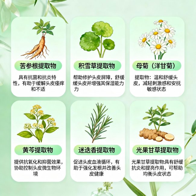 (二)12种植物精粹舒缓体系:协同修复头皮屏障