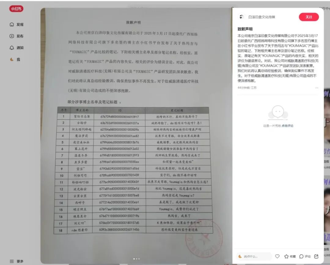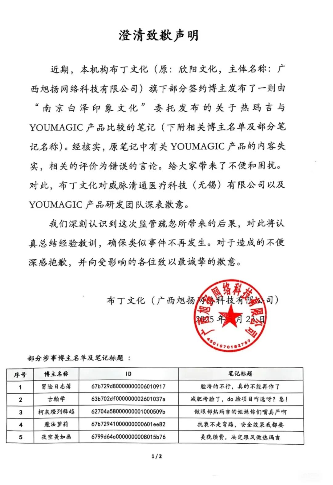 2025年3月起,南京白泽印象文化传媒有限公司委托布丁文化(原欣阳文化,主体名称:广西旭扬网络科技有限公司)旗下多名签约博主,在小红书发布了一系列将热玛吉与YOUMAGIC产品进行对比的笔记。这些内容通过片面截取产品信息、夸大技术差异、编造用户负面体验等方式,对YOUMAGIC产品的安全性与有效性进行了系统性贬损。